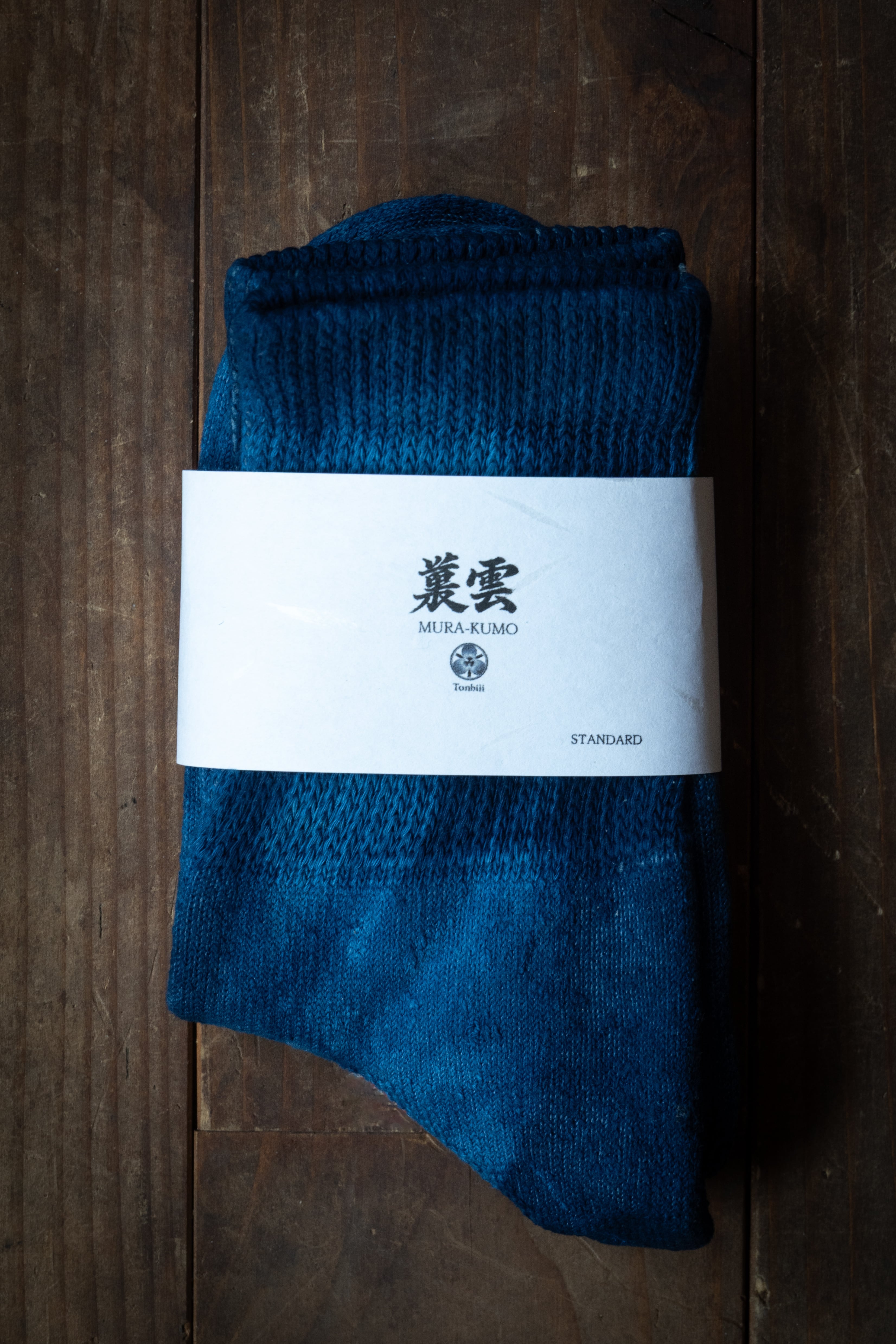 天然灰汁発酵建てによる本藍染で染め上げた、一点一点表情の異なる靴下。